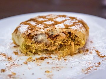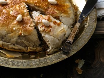 Golden Filo pastry filled with spiced Chicken, Egg, Caramelised Onion and Toasted Almonds, finished with Cinnamon and icing sugar