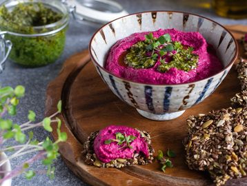 Smooth chickpea & beetroot dip with garlic, lemon & olive oil