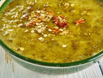 Creamy green split pea soup with garlic, olive oil & cumin