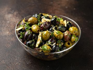 Olives marinated in Chermoula with Garlic and Preserved Lemon