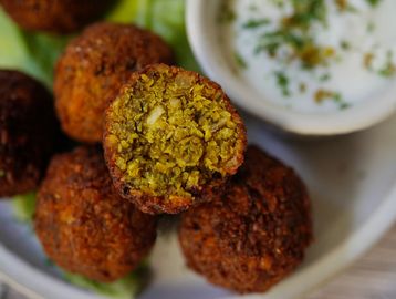 Falafel with Haloumi Cheese, Houmous, Aubergine, Tomato and Caramelised Onions